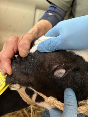 片目または両目が感染すると、流涙、目ヤニ、まばたきの増加、結膜の腫脹充血が見られます。角膜に白い斑点が見られる場合は、角膜炎の始まりです。まぶしさや痛みで目が開けられない牛もいます。