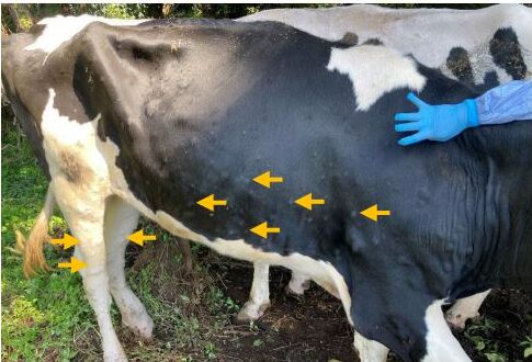 主な症状は、全身の皮膚に結節病変(イボ)ができ、発熱や乳量の低下がみられます。残念ながら本病に対する有効な治療法はありません。本病ウイルスは、環境中で長期間生存する可能性があり、乾燥したかさぶたで35日間、日光が当たらない環境の中で数カ月生存することが報告されています。このウイルスには、エタノールや次亜塩素酸ナトリウム、逆性石鹸等の畜産現場で用いられる一般的な多くの消毒剤が有効です。