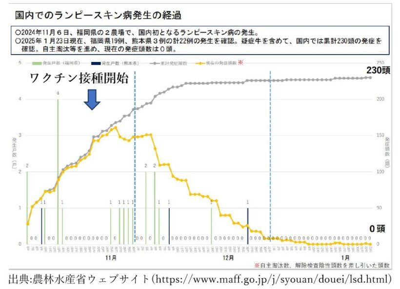 韓国では、全頭へのワクチン接種以降、発生件数が大幅に減少したことも報告されています。日本国内でのランピースキン病発生の経過についてのグラフを見ても、11月21日のワクチン接種を契機として、発症頭数が減少に転じていることがわかります。